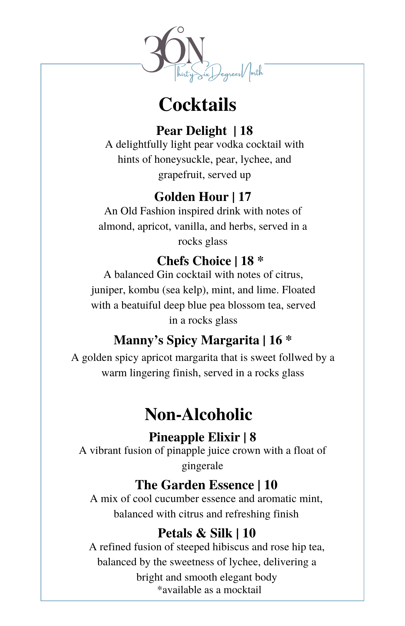 Our dishes feature in season, fresh ingredients that occasionally rotate to ensure quality. It is always best to call if you have any specific questions regarding our menus.
